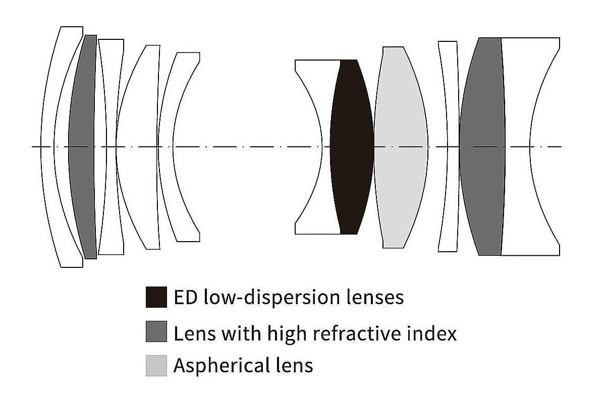 Jeśli chodzi o konstrukcję optyczną, mamy tutaj do czynienia z 11 soczewkami ustawionymi w 9 grupach. Pośród nich znajdziemy jeden element wykonany z niskodyspersyjnego szkła ED, dwie soczewki, które wykonano ze szkła o wysokim współczynniku załamania światła (HR) oraz jedną soczewkę asferyczną. Producent nie pożałował więc elementów specjalnych, co jest godne odnotowania, jeśli weźmiemy pod uwagę przystępną cenę tego modelu. Wewnątrz znajdziemy jeszcze kołową przysłonę o dziewięciu listkach, którą możemy domknąć maksymalnie do wartości f/16.