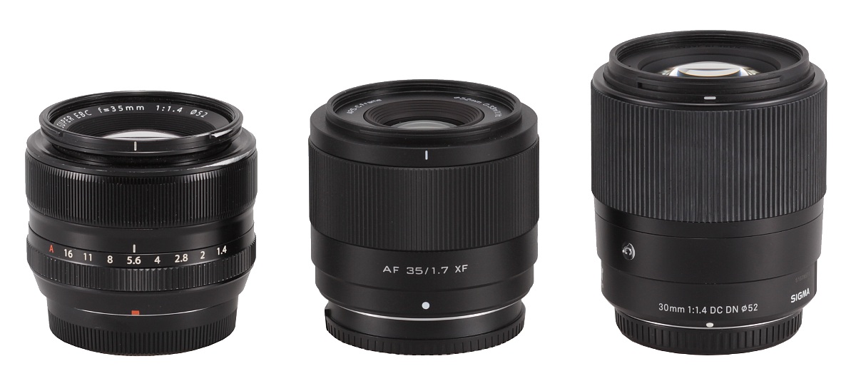 Na poniższym zdjęciu Viltrox 1.7/35 stoi pomiędzy jaśniejszymi konkurentami, czyli Fujinonem XF 35 mm f/1.4 R oraz Sigmą C 30 mm f/1.4 DC DN. Teraz można docenić jak zgrabny był Fujinon, bo pomimo lepszego światła nie różni się on istotnie rozmiarami od Viltroksa. Warto jednak pamiętać, że miało to swoje konsekwencje w jego osiągach optycznych. Nieprzypadkowo, jego następca czyli Fujinon XF 33 mm f/1.4 R LM WR jest już znacznie większy.