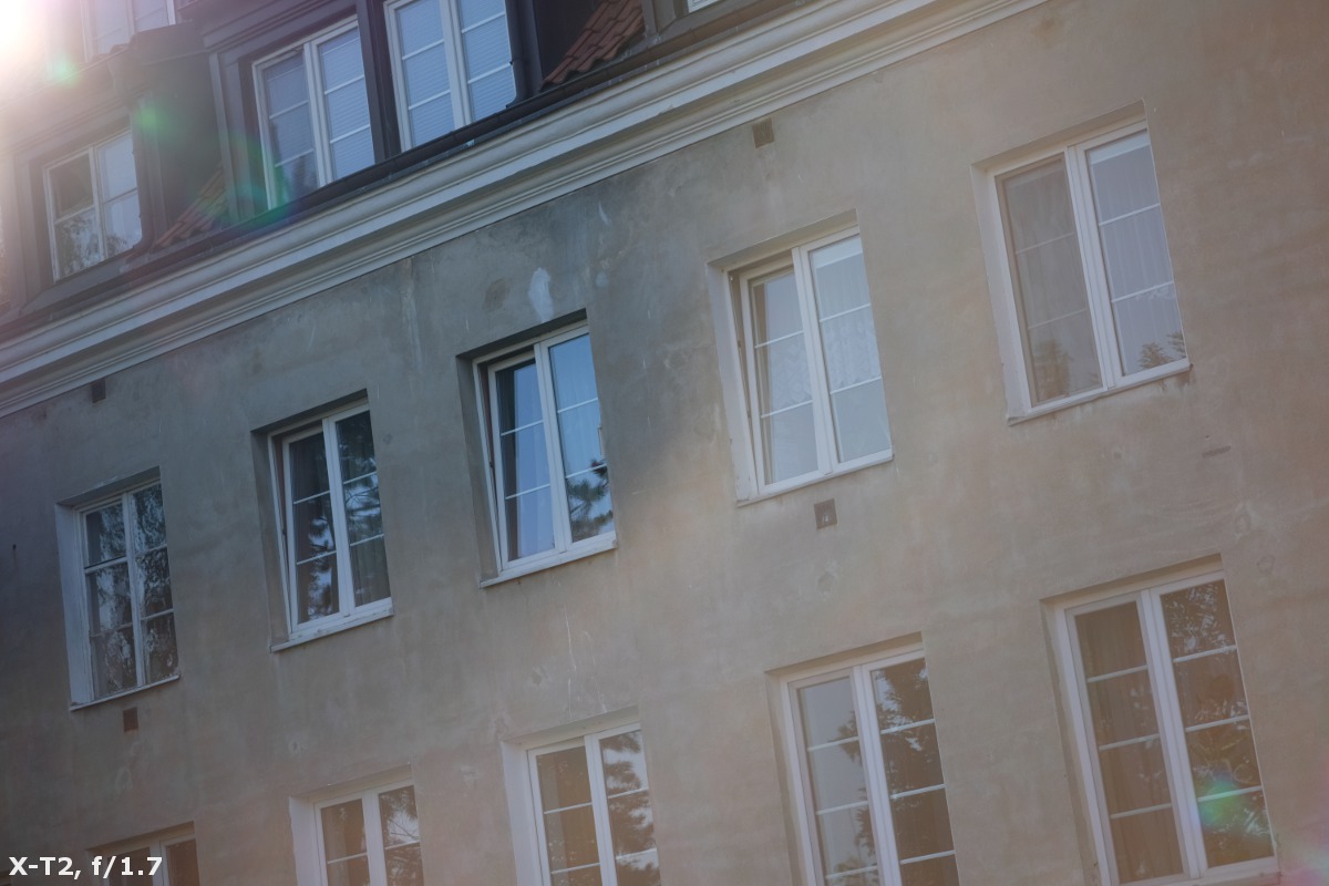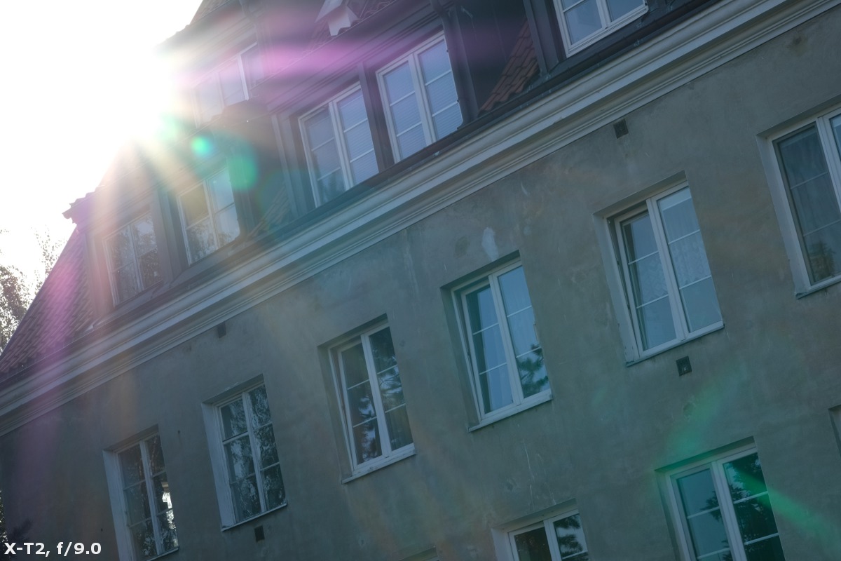 Szczególnie słabo prezentuje się zachowanie w momencie, gdy ostre źródło światła umieścimy tuż poza kadrem. Wtedy, gdy mamy mocno przymkniętą przysłonę, róg kadru potrafi rozświetlić się bardzo jasną flarą, która wraz z oddalaniem się od słońca przechodzi w duży i łatwo dostrzegalny łuk świetlny.