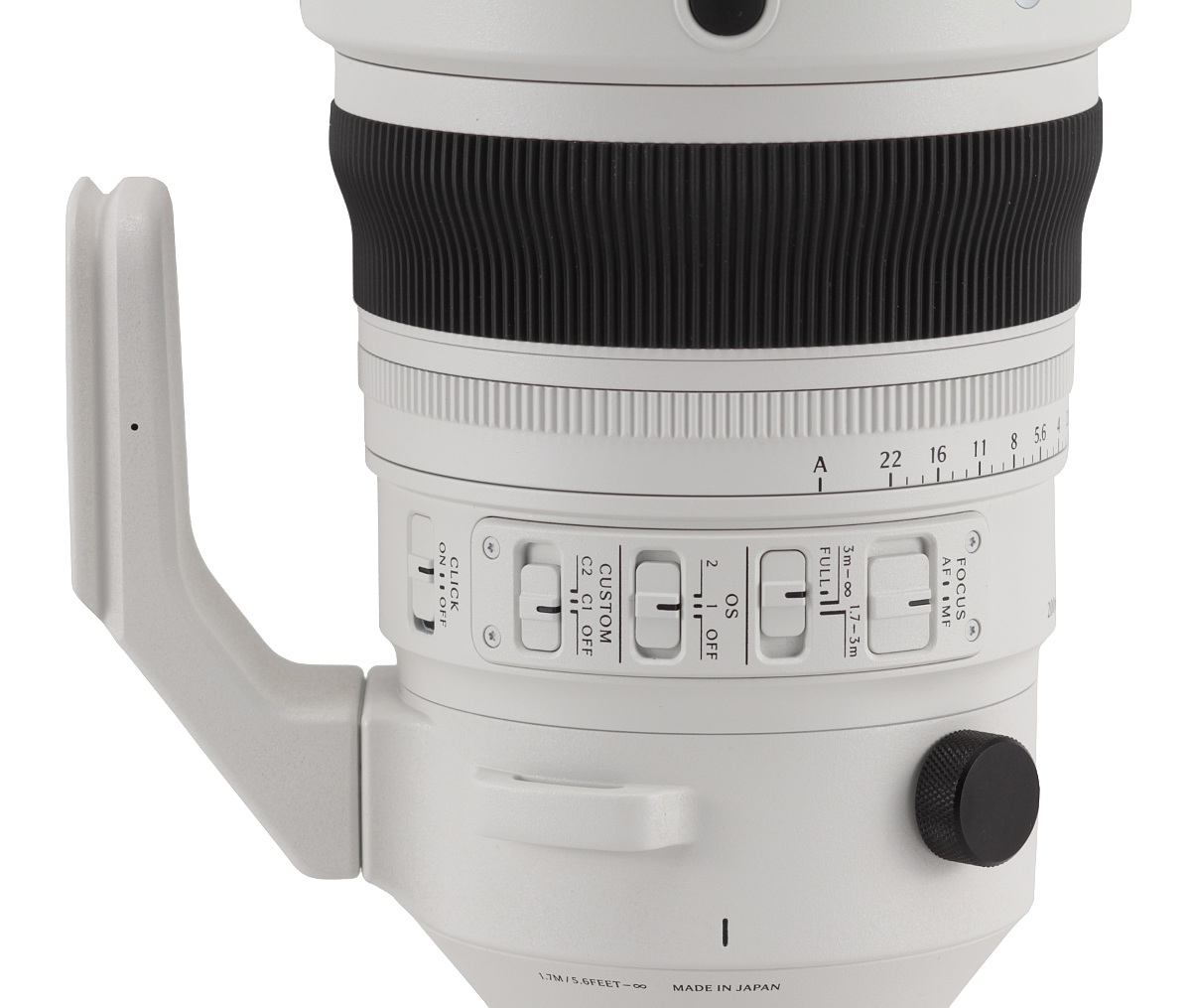 Na następnej części korpusu, patrząc od góry, znajdziemy napis z nazwą i parametrami obiektywu, po prawej stronie znajdziemy nowe logo producenta oraz numer seryjny, a jeszcze trochę dalej przełącznik LOCK, który służy do blokowania pierścienia przysłon albo do zakresu od f/2 do f/22, albo w pozycji A (Auto). Natomiast po lewej stronie mamy cały szereg innych przełączników. Pierwszy z nich, FOCUS, służy do ustawiania trybu pracy mechanizmu ustawiającego ostrość i mamy do wyboru dwa położenia: AF i MF. Kolejny przełącznik służy do ograniczania zakresu pracy autofokusa. Do wyboru mamy trzy położenia: FULL, od 3 metrów do nieskończoności i od minimalnego dystansu do 3 metrów. Dalej mamy przełącznik OS sterujący stabilizacją optyczną (tryby 1, 2 i OFF), a na samym końcu przełącznik podpisany jako CUSTOM, dający wybór pomiędzy pozycjami OFF, C1 i C2 i służący do wyboru trybów pracy mechanizmu ustawiającego ostrość zapisanych przez użytkownika po skalibrowaniu obiektywu przez Sigma USB Dock. Jeszcze dalej znajdziemy przełącznik CLICK ON/OFF, którym możemy wybierać tryb pracy pierścienia przysłon ze skokowego na płynny.