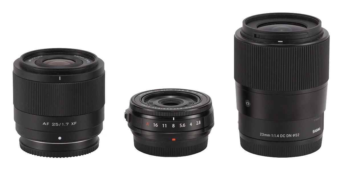 Na poniższym zdjęciu testowany obiektyw stoi pomiędzy dwoma innymi obiektywami o podobnej ogniskowej, ale zauważalnie jaśniejszymi i przez to wyraźnie większymi. Po lewej mamy Viltroksa AF 25 mm f/1.7 Air a po prawej Sigmę C 23 mm f/1.4 DC DN.