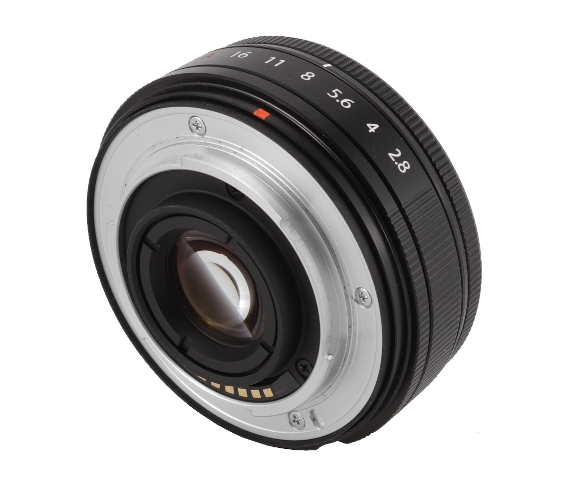 Fujinon XF 23 mm f/2.8 R WR rozpoczyna się metalowym bagnetem, który otacza styki i ciemną oraz matową tulejkę lekko wystającą ponad płaszczyznę wyznaczoną przez styki. Wewnątrz tej tulejki porusza się tylna soczewka o średnicy 18 mm. Przy ostrości ustawionej na minimalny dystans znajduje się ona na głębokości prawie 1 cm od rantu tulejki, natomiast dla nieskończoności leży ona mniej więcej na wysokości styków. Wszystko jest tam jednak bardzo dobrze wyczernione, zmatowione, a jednocześnie nie mamy żadnych szpar, przez które można dojrzeć jakieś elementy wnętrza obiektywu i elektroniki.