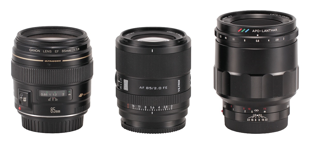 Na poniższym zdjęciu Viltrox AF 85 mm f/2 EVO stoi pomiędzy lustrzankowym Canonem EF 85 mm f/1.8 USM, a Voigtlanderem Apo-Lantharem 2/65 Macro. Ten ostatni obiektyw jest tutaj ewidentnie największy i na dodatek zwiększa swoje rozmiary wraz z ustawianiem ostrości oraz nie ma autofokusa. Jako jedyny w tej grupie oferuje jednak opcję makro.