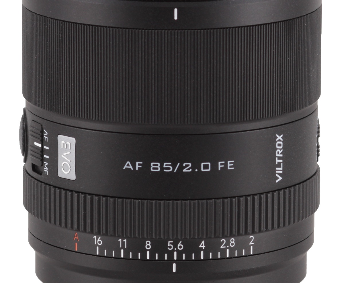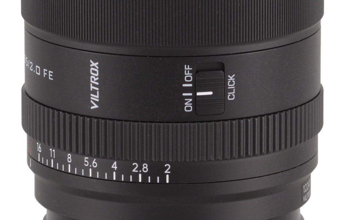 Idąc dalej znajdziemy napis "AF 85/2.0 FE" otoczony znaczkiem EVO z jednej strony i logotypem producenta z drugiej. Z boku umieszczono jeszcze przełącznik AF/MF, a pod nim okrągły przycisk funkcyjny. Natomiast po drugiej stronie mamy przełącznik CLICK ON/OFF, który służy do wyboru tryby pracy pierścienia do zmiany przysłony z płynnej na skokową.