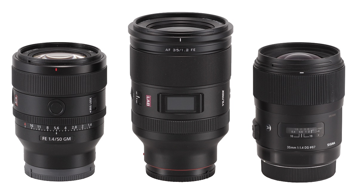 Na poniższym zdjęciu Viltrox AF 35 mm f/1.2 LAB stoi pomiędzy Sony FE 50 mm f/1.4 GM a Sigmą A 35 mm f/1.4 DG HSM. Pamiętacie jeszcze te czasy, gdy właśnie ta Sigma była uznawana za obiektyw duży i ciężki?