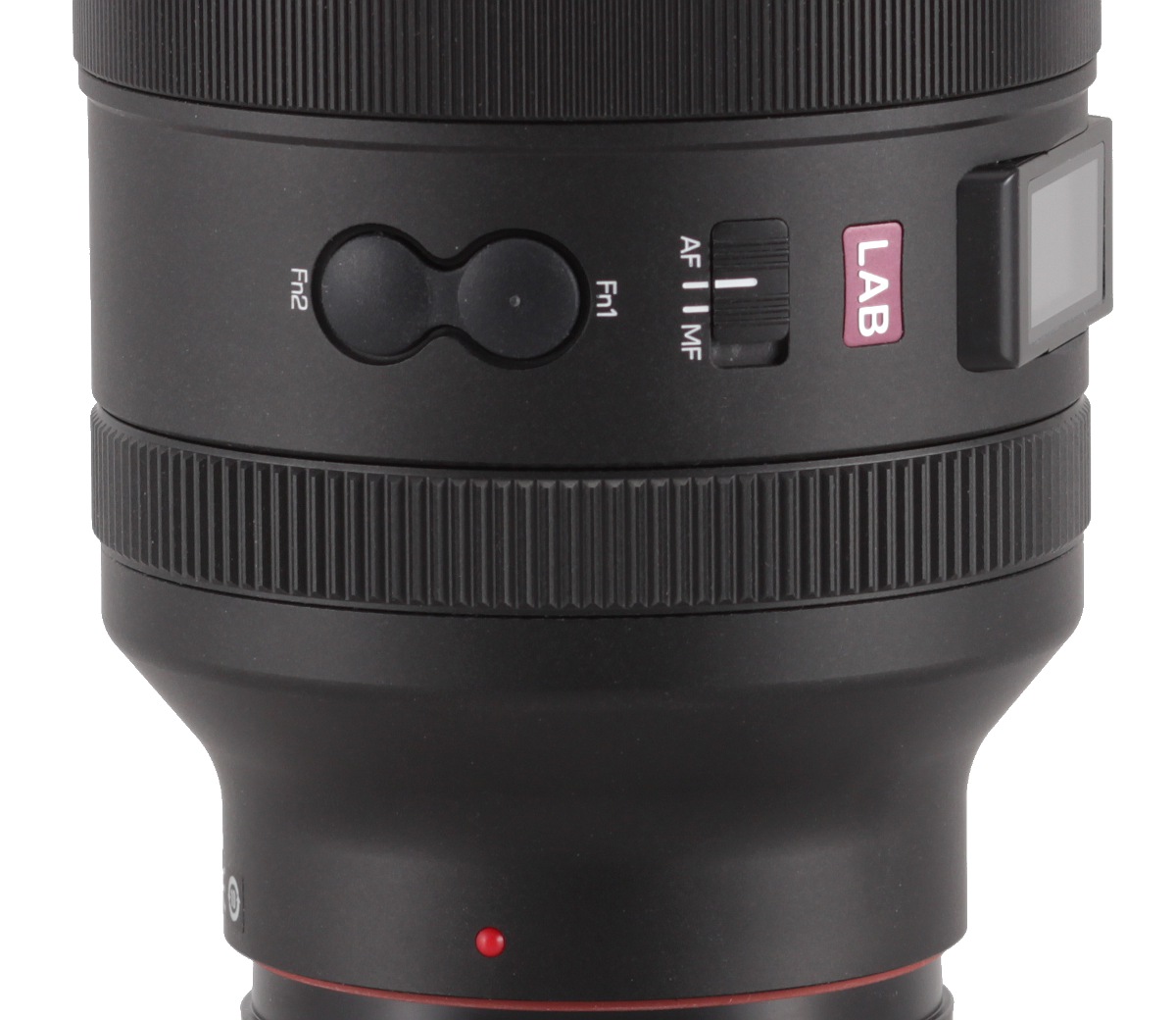 Patrząc z góry, po lewej stronie wyświetlacza LCD, natrafimy na czerwony znaczek z nazwą serii (LAB), przełącznik AF/MF oraz dwa programowalne przyciski funkcyjne Fn1 i Fn2. Natomiast po drugiej stronie wyświetlacza znajdziemy logotyp producenta oraz przełącznik CLICK ON/OFF służący do wyboru trybu pracy pierścienia przysłony.