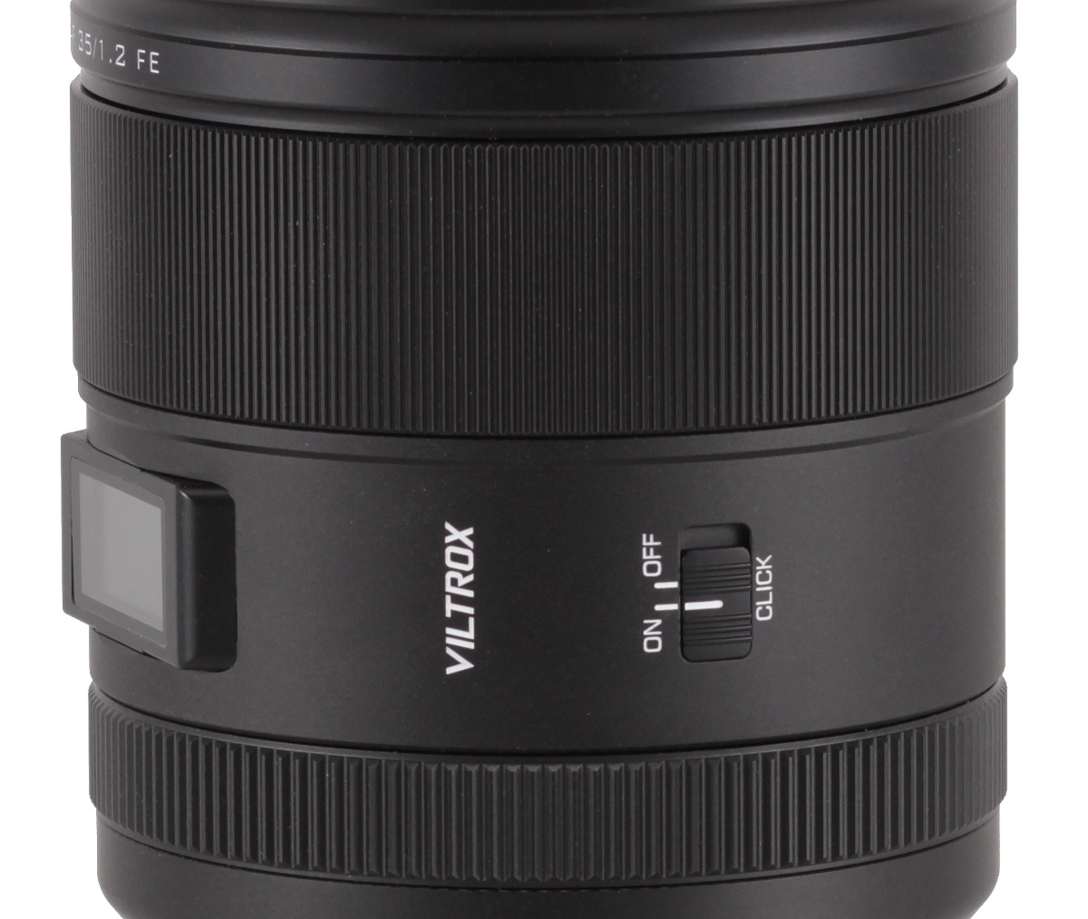 Pierwszym elementem właściwego korpusu Viltroksa 1.2/35 LAB jest czarny, metalowy, nieruchomy i zwiększający swoją średnicę pierścień, na którym znajdziemy czerwoną kropkę ułatwiającą mocowanie obiektywu do aparatu, numer seryjny oraz informację o miejscu produkcji, którym w tym przypadku są Chiny.