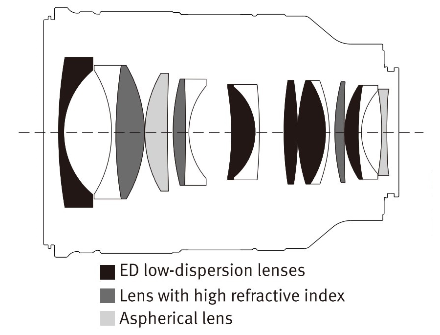 Jeśli chodzi o konstrukcję optyczną, mamy tutaj do czynienia z 15 soczewkami ustawionymi w 10 grupach. Pośród nich znajdziemy aż pięć elementów wykonanych z niskodyspersyjnego szkła ED, trzy soczewki, które wytworzono ze szkła o wysokim współczynniku załamania światła (HR) oraz dwie, którym nadano kształt asferyczny. Producent nie pożałował więc elementów specjalnych. Wewnątrz znajdziemy jeszcze kołową przysłonę o 11 listkach, którą możemy domknąć maksymalnie do wartości f/16.
