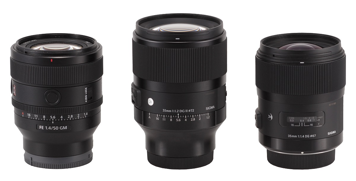 Na poniższym zdjęciu Sigma A 35 mm f/1.2 DG II stoi pomiędzy Sony FE 50 mm f/1.4 GM, a lustrzankową Sigmą A 35 mm f/1.4 DG HSM.