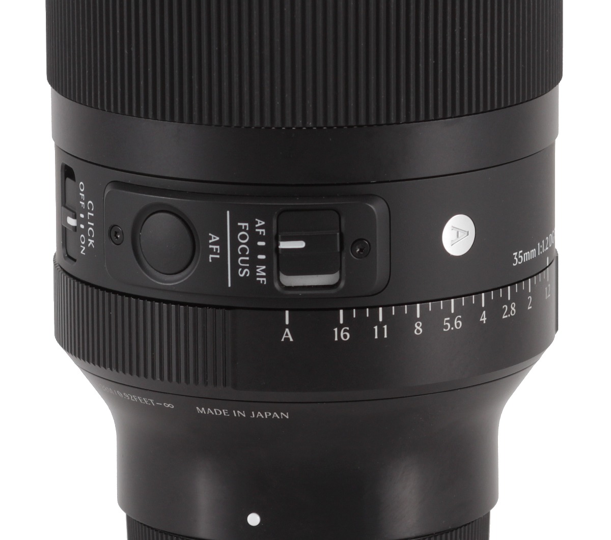 Idąc dalej, natrafimy na nieruchomy i pokryty tworzywem sztucznym element, na którym znajdziemy logo firmy, nazwę i parametry obiektywu, jego numer seryjny, drobne karbowanie, symbol „A”, który oznacza zaklasyfikowanie instrumentu do linii Art, oraz serię przełączników. Pierwszy z nich – AF/MF FOCUS – służy do wyboru trybu pracy mechanizmu ustawiającego ostrość. Drugi – AFL – pozwala na przywołanie odpowiedniej pozycji autofokusa, ale jednocześnie mogą mu być przypisane inne funkcje. Pod nim znajduje się jeszcze przełącznik CLICK OFF/ON, który ustawia tryb pracy pierścienia przysłon. Po drugiej stronie znajdziemy przełącznik blokady pierścienia przysłon albo na pozycji A, albo w przedziale od f/1.2 do f/16.
