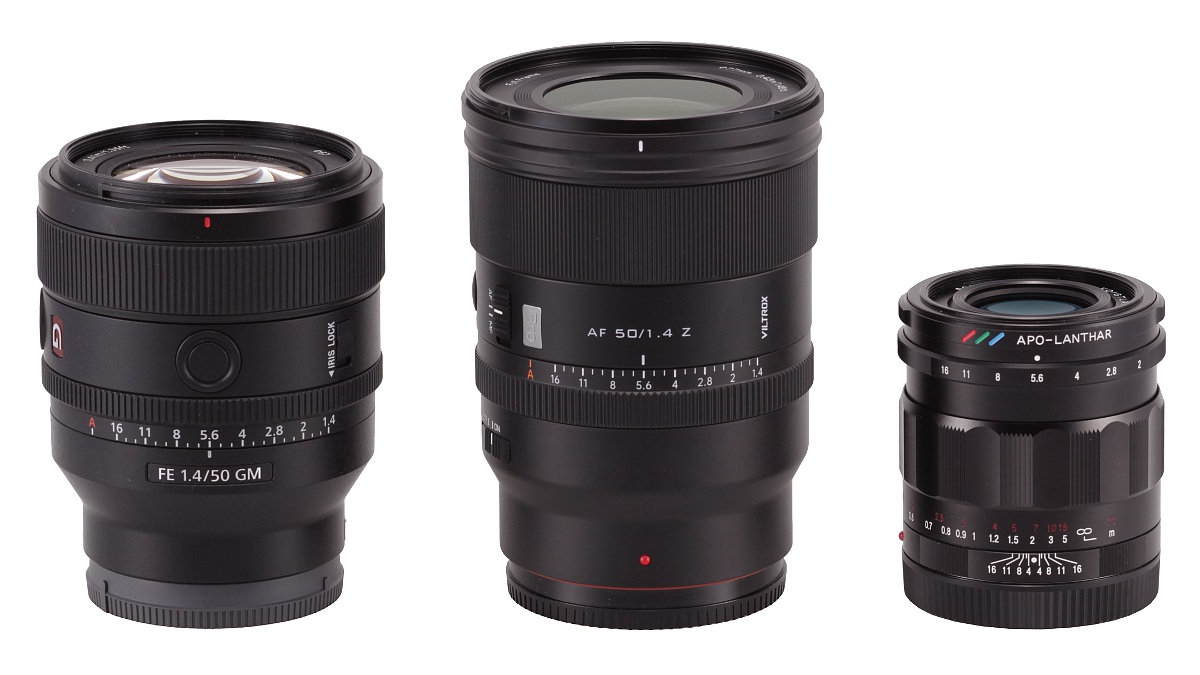Na poniższym zdjęciu Viltrox AF 50 mm f/1.4 Pro stoi pomiędzy Sony FE 50 mm f/1.4 GM oraz Voigtlanderem Apo Lantharem 2/50. Szczególnie porównanie tych pierwszych dwóch modeli jest ciekawe, bo są one bezpośrednimi konkurentami.