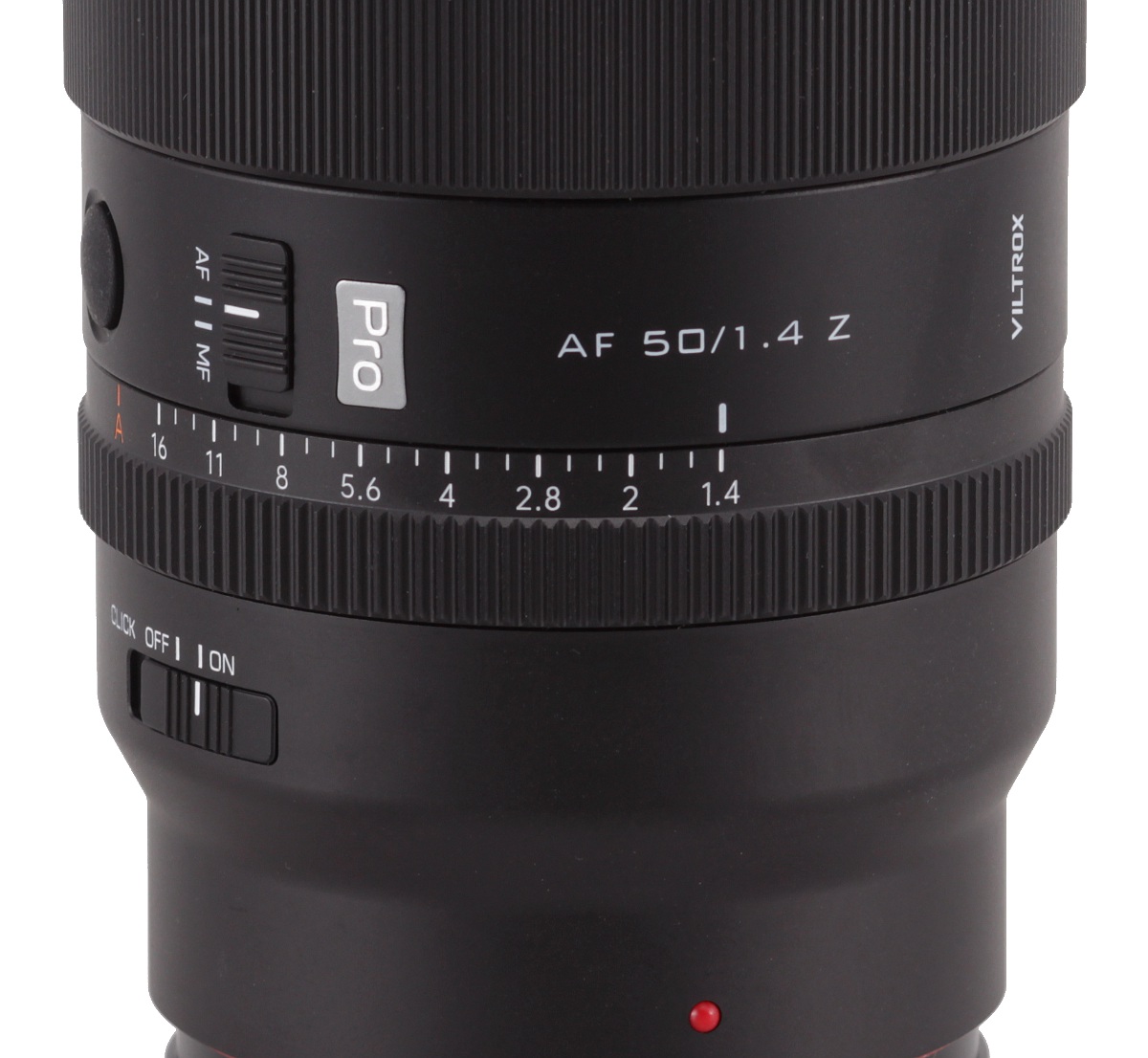 Pierwszym elementem właściwego korpusu Viltroksa AF 1.4/50 Pro jest czarny, metalowy, nieruchomy i zwiększający swoją średnicę pierścień, na którym znajdziemy czerwoną kropkę ułatwiającą mocowanie obiektywu do aparatu, numer seryjny, informację o miejscu produkcji, którym w tym przypadku są Chiny, oraz przełącznik CLICK ON/OFF, który służy do wyboru trybu pracy pierścienia przysłony z płynnej na skokową.