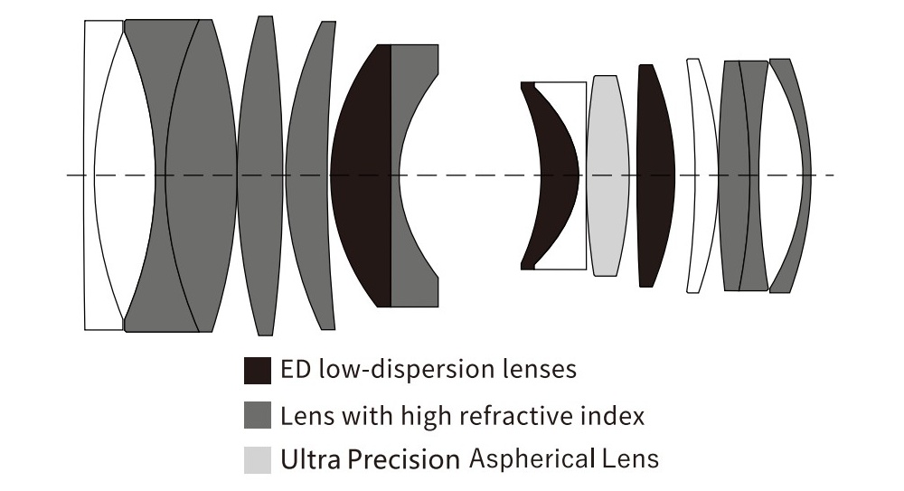 Jeśli chodzi o konstrukcję optyczną, mamy tutaj do czynienia z 15 soczewkami ustawionymi w 11 grupach. Nie żałowano elementów specjalnych, pośród nich znajdziemy jedną soczewkę asferyczną, trzy soczewki wykonane z niskodyspersyjnego szkła ED oraz aż osiem elementów ze szkła o wysokim współczynniku załamania światła. Wewnątrz mamy jeszcze kołową przysłonę o 11 listkach, którą można maksymalnie domknąć do wartości f/16.
