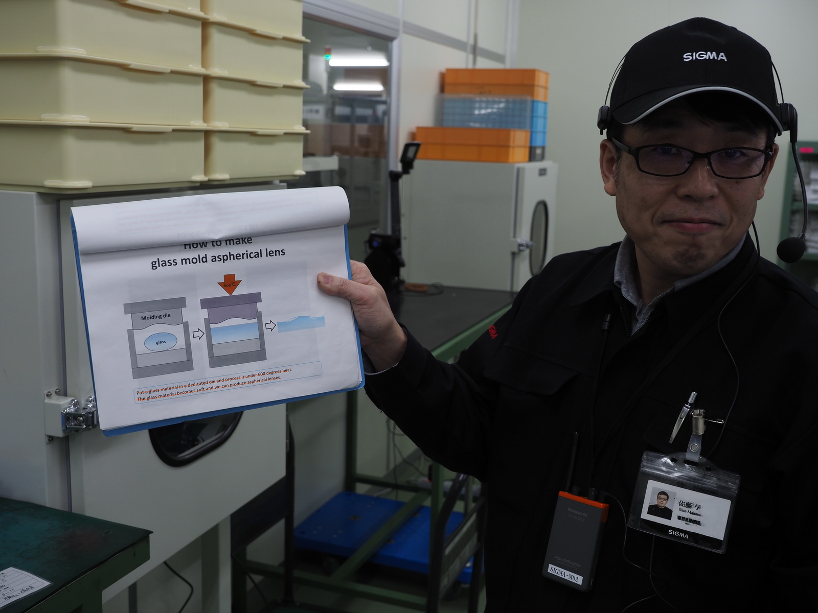 W innym pomieszczeniu produkowane są formowane na gorąco soczewki asferyczne. Choć są to elementy, które pozwalają dość łatwo wyeliminować w obiektywie liczne aberracje bez zbytniego komplikowania jego konstrukcji wewnętrznej, to niestety ich produkcja okazuje się dość droga. Wyprodukowanie tego typu soczewki wymaga podgrzania szkła do temperatury 600 stopni i umieszczenia go w prasie, która nada mu odpowiedni kształt. Proces ten nie tylko wymaga zastosowania drogich, specjalistycznych maszyn, ale też jest bardzo czasochłonny. Produkcja jednej soczewki potrafi zająć nawet 2 godziny.