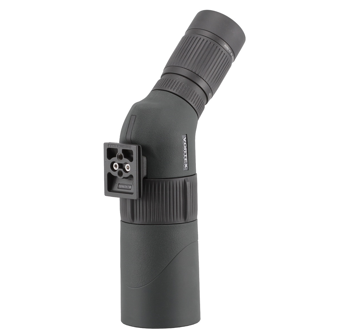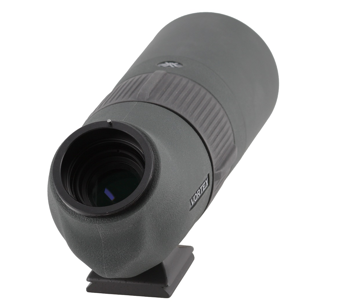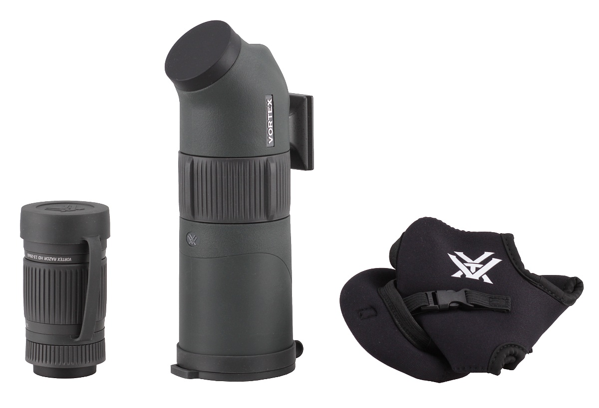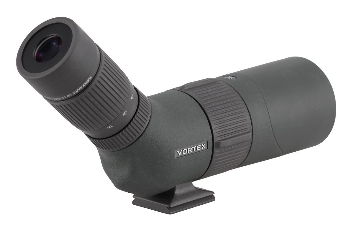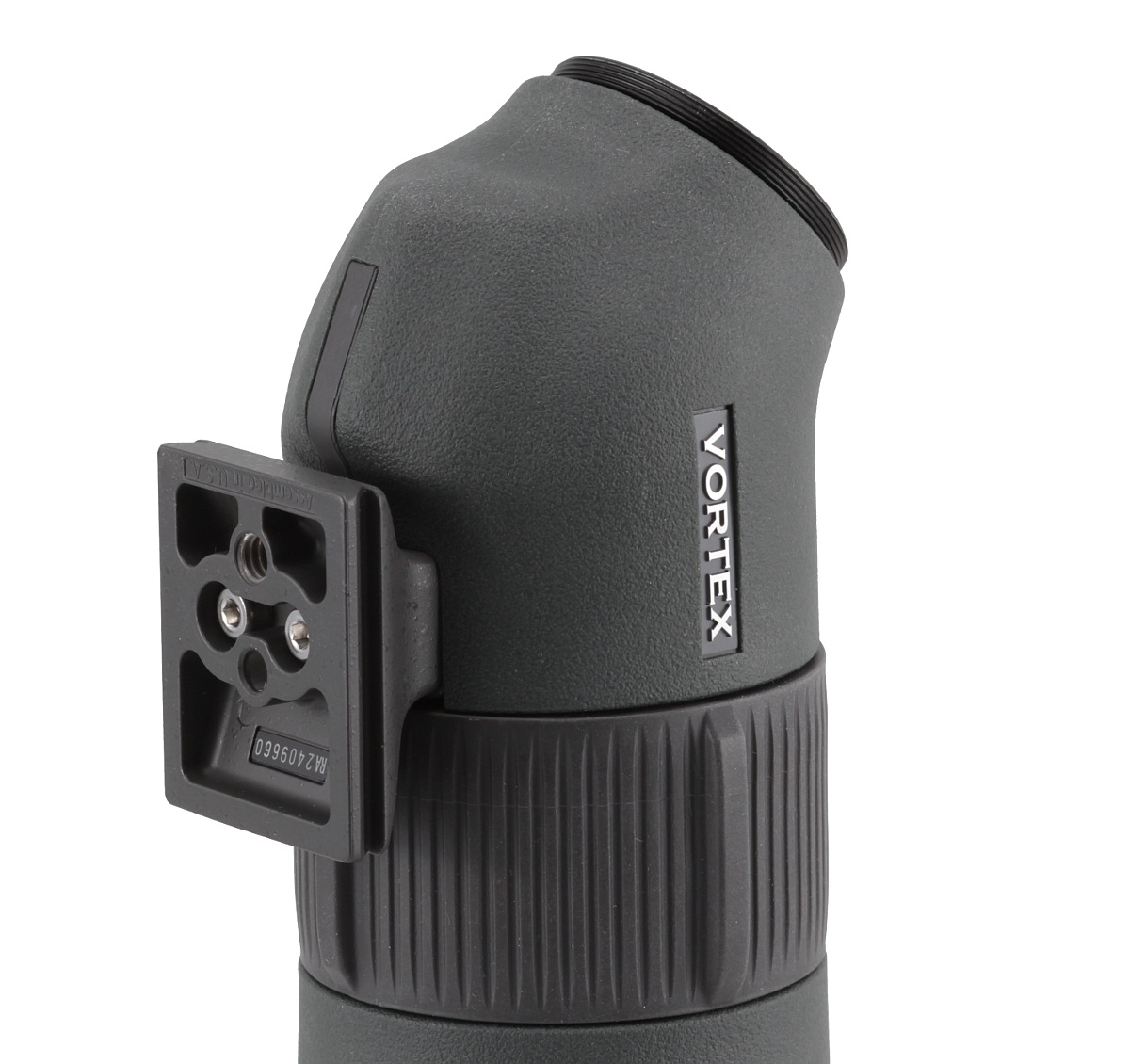 Następny element to łamana część tubusu zawierająca układ pryzmatów dachowych. Pokryto ją matową i zieloną gumą o delikatnej teksturze. Tutaj też wszystko przylega idealnie. Dodatkowo po obu stronach lunety umieszczono nazwę producenta, a na dole dołożono metalowy łącznik statywowy w standardzie Arca Swiss. Jest on przymocowany do tubusu dwiema śrubami imbusowymi, co pozwala odkręcić łącznik od lunety na stałe i dodatkowo ograniczyć wagę oraz gabaryty. Na owym łączniku umieszczono numer seryjny produktu oraz informację o tym, że został on złożony w USA. To dobra wiadomość. Większość elementów składowych Razorów jest produkowana w Japonii, reszta pewnie w pozostałych rejonach Azji, ale cieszy fakt, że wszystko jest składane w centrali firmy leżącej w Stanach Zjednoczonych. Można ufać, że zapewnia to skuteczniejszą kontrolę jakości i pozwala na świadczenie lepszych usług serwisowych.