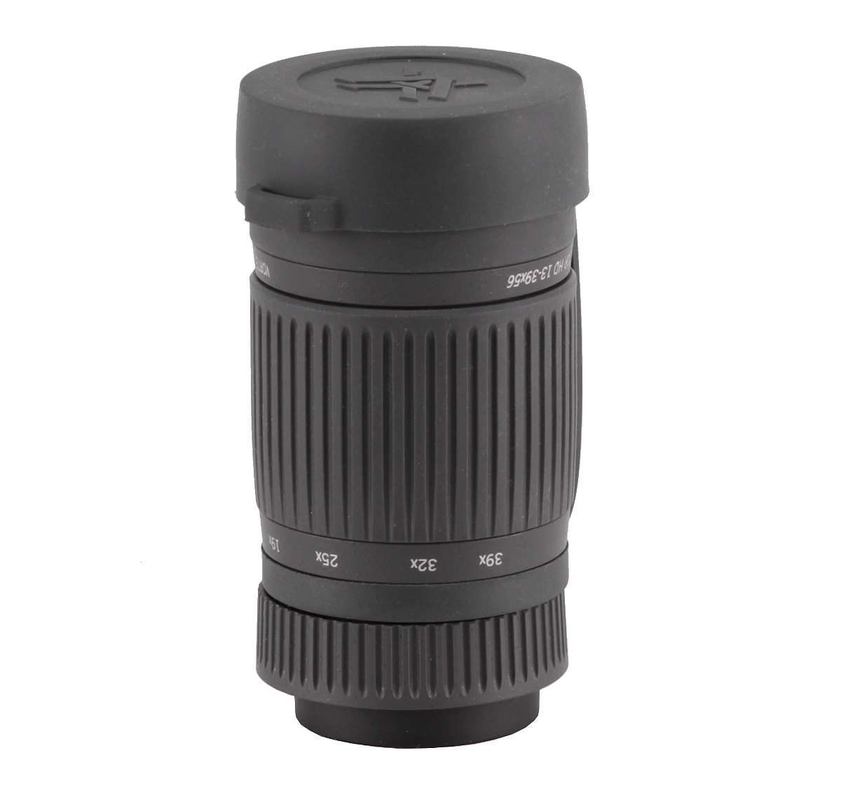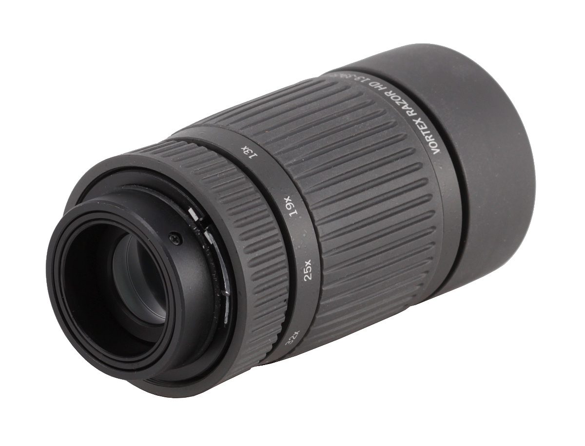 Sam korpus okularu też jest wykonany z kompozytów magnezowych. Warto jednak pamiętać, że jego największą część stanowi gumowany i karbowany pierścień do zmiany powiększenia. Pracuje on z równym i dość sporym, ale wciąż prawidłowym oporem. Po obu stronach tego pierścienia na metalowej obudowie znajdziemy napisy. Na dole zawierają one znaczniki powiększenia dla wartości 13, 19, 25, 32 i 39 razy, a u góry mamy po prostu pełną nazwę lunety, czyli Vortex Razor HD 13-39x56. Okular kończy się wspominaną już gumowaną muszą okularową, której wysokość można regulować na trzech poziomach wysokości.